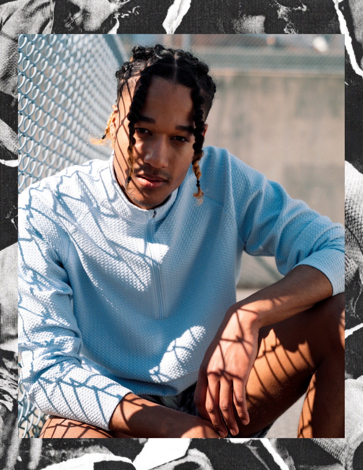 Converse All Stars shoes on top of a counter over a neon sign.